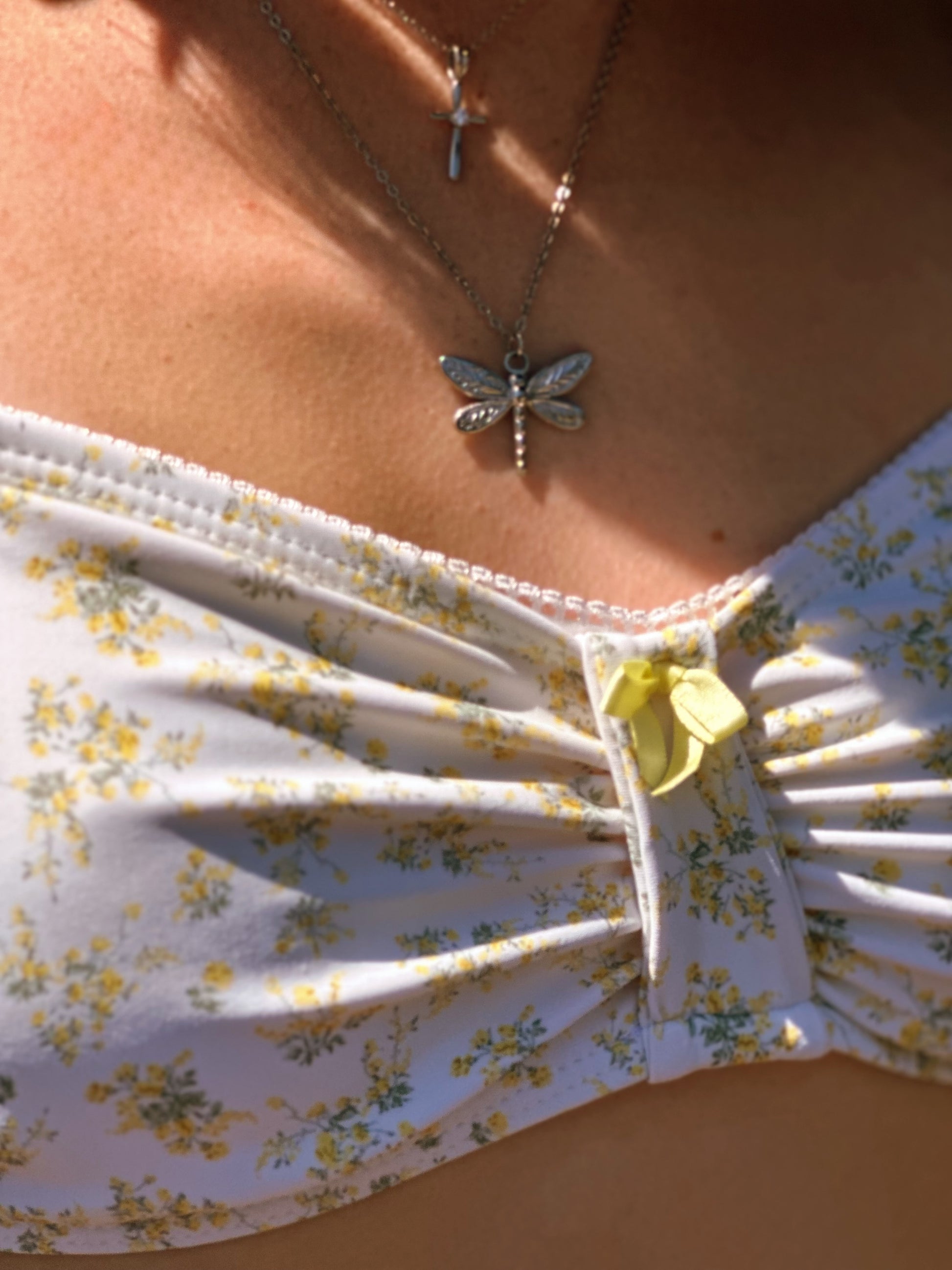 Honeydew - Sweet, delicate, and just a little flirty — the Honeydew bikini is your go-to for dreamy summer days. Featuring a soft white base sprinkled with tiny yellow florals, this suit brings that fresh-picked, sun-kissed energy wherever you go. Finished with dainty white lace trim, Honeydew blends cottage core charm with poolside allure. Whether you’re lounging in a garden or diving into crystal waves, this bikini is pure summertime softness.