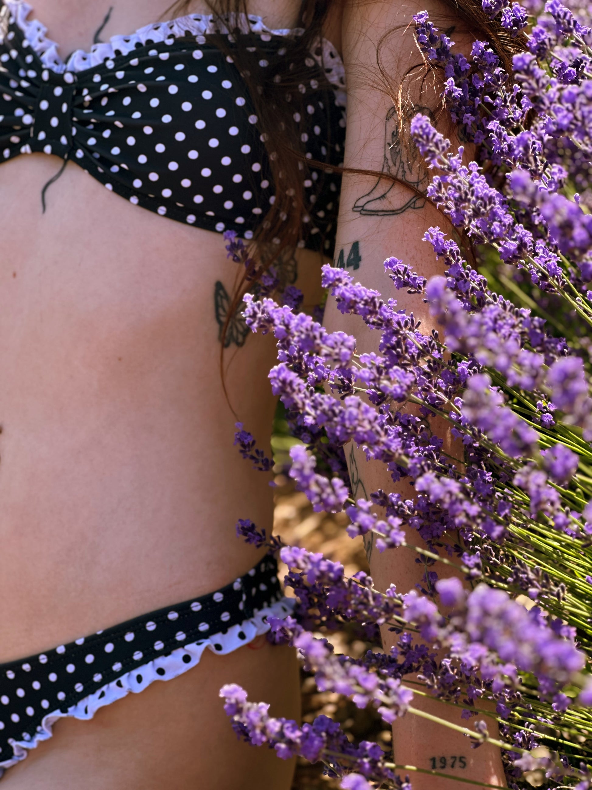 Lavender Darling - Soft, sweet, and just the right amount of flirty — Sunday Sugar is your go-to bikini for days that start slow and end with sunshine-kissed skin. This black and white polka dot set features delicate ruffle trim and a ruched front detail that adds the perfect vintage touch. Designed to feel feminine and fun, with a flattering fit that hugs you in all the right places. It’s giving picnic in the lavender fields… with a side of sass.