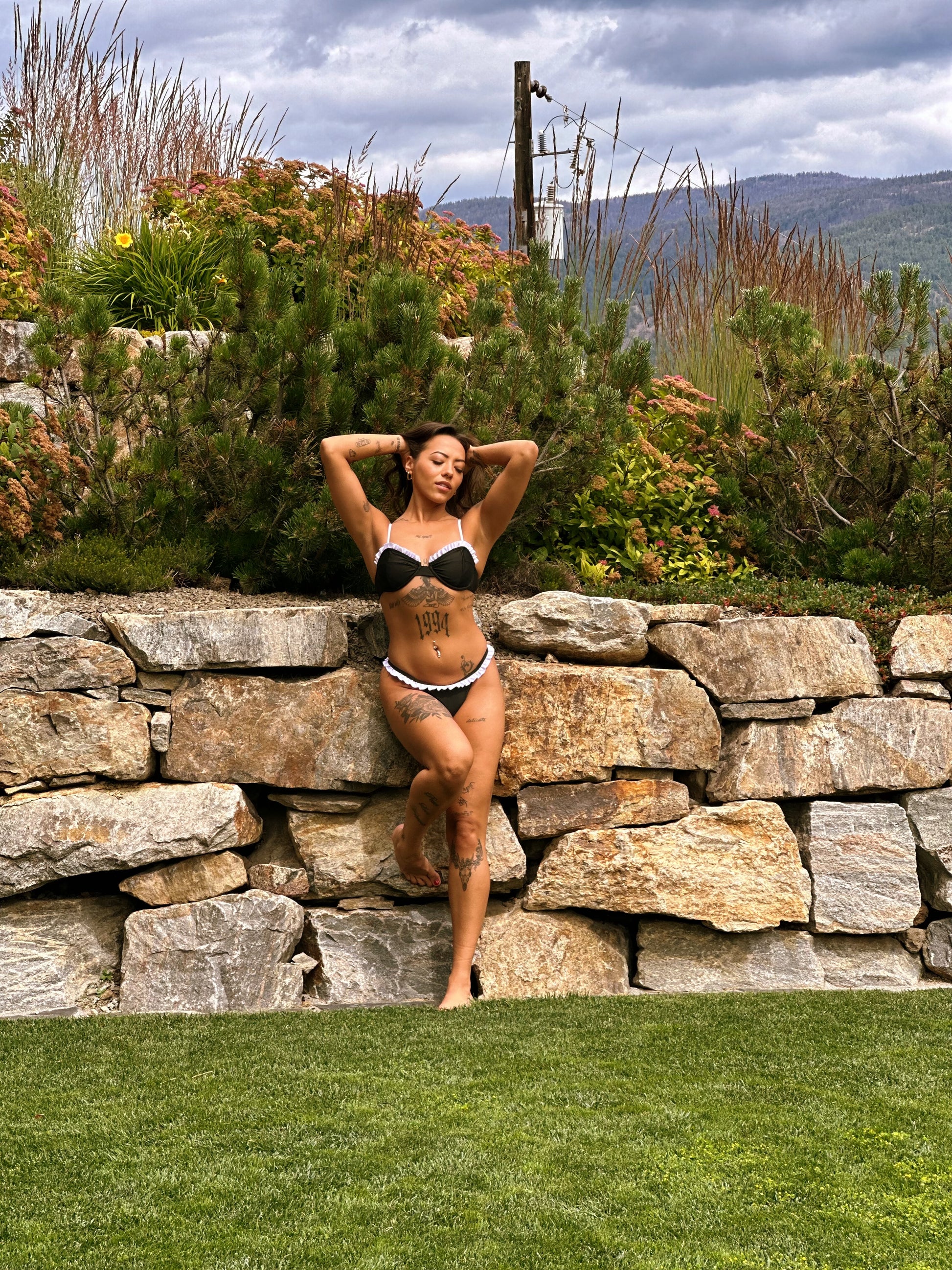 Pillow Talk- Flirty, feminine, and irresistibly cheeky — the Pillow Talk bikini is your new poolside obsession. This black set features delicate white ruffle trim along the bust and waist, giving it a sultry vintage vibe with a playful twist. Adjustable straps and a flattering cut make it both comfy and captivating. Whether you’re lounging under the sun or making waves, this set is made for sweet summer secrets and stolen glances.